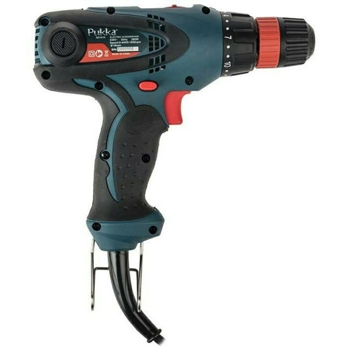 دریل پیچ گوشتی برقی فوق یکی از محصولات شرکت «پوکا» (Pukka) است. این دستگاه مدل «SD1010» نام دارد و توان آن 280 وات است. یکی از مزایای این پیچ گوشتی برقی قابلیت کنترل سرعت آن است. سرعت چرخش این دستگاه را میتوان در دو حالت 440-0 و 1650-0 دور بر دقیقه تنظیم کرد. میزان گشتاور این دستگاه نیز در 18 حالت قابل تنظیم بوده و از قابلیتهای یک دستگاه دریل و یک دستگاه پیچ گوشتی برخوردار است. در حالتی که سرعت چرخش کمتر است دستگاه در حالت پیچ گوشتی قرار میگیرد و در سرعت بالاتر، دستگاه مانند یک دریل عمل میکند. این دریل پیچ گوشتی از قابلیت چرخش در هر دو جهت برخوردار است. از دیگر مزیتهای این محصول میتوان به وجود یک لامپ ال ای دی در قسمت پایینی دسته آن اشاره کرد. سهنظام این دریل پیچ گوشتی خودکار بوده و سایزی 10 میلیمتری دارد.